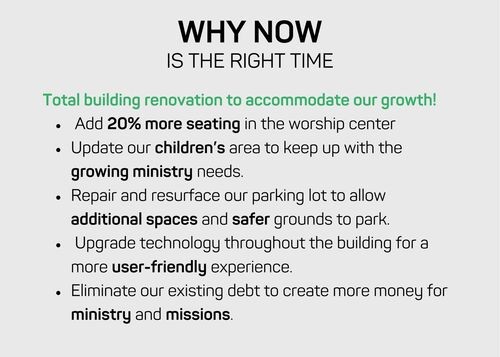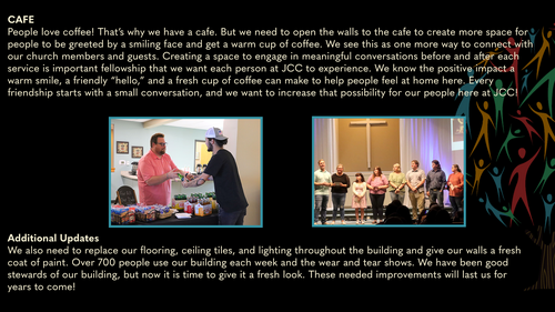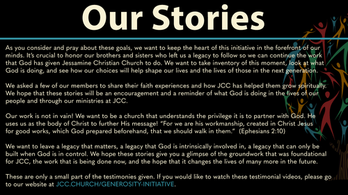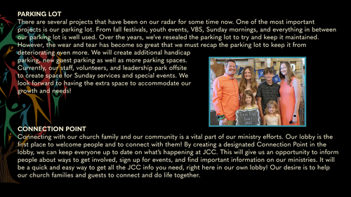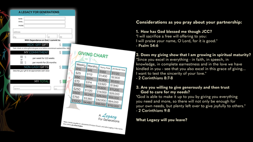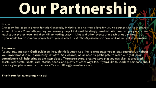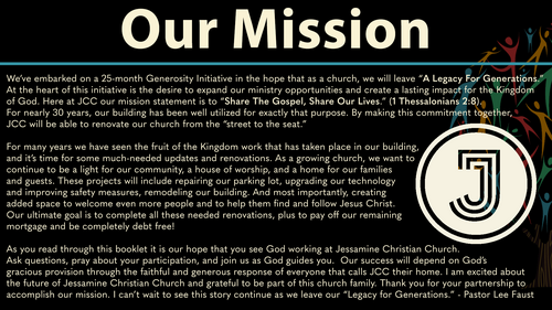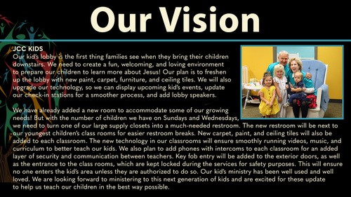 This is a God-sent, God-sized vision for Jessamine Christian Church and I'm extremely excited about the future of JCC and am grateful to be a part of this church family. Thank you for your partnership in accomplishing our vision. I cannot wait to see the Lord's blessing poured out in our church and community as we give to create,