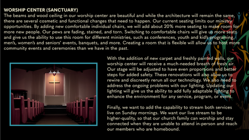 We have a desire to keep reaching people for Christ, so we want to create more room for new people and ensure that our ministry spaces are inviting. To help accomplish these goals, we want to upgrade and renovate our building, as well as pay off our existing mortgage. This generosity initiative will position us for even greater impact for the Kingdom.